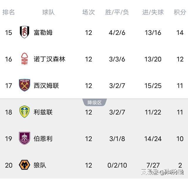 随着这场比赛的结束,英超第12轮的所有赛事都落下了帷幕。阿森纳依旧稳稳占据积分榜榜首,领先第二名的优势达6分。切尔西凭借微弱的积分优势排在第三位,曼城则紧随其后。第二到第五名的队伍之间,积分差距仅有3分。而上赛季的卫冕冠军利物浦则遭遇滑坡,目前排名已下滑至第12位。狼队的处境最为严峻,至今仍未取得一场胜利,暂时排名联赛倒数第一,降级的危机已经十分明显。返回搜狐,查看更多