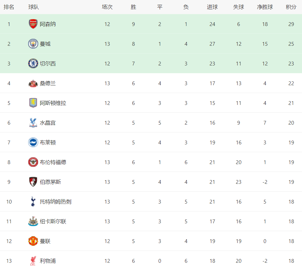 在积分榜上,阿森纳以29分排名榜首。曼城赢球之后,总积分达到25分,升到了第2名。切尔西23分排名第3。第4的是桑德兰,拿到22分。阿斯顿维拉以21分排名第5。水晶宫20分排名第6。热刺只拿到18分,排名第10。纽卡斯尔联、曼联、利物浦和埃弗顿这些球队也都是18个积分。返回搜狐,查看更多