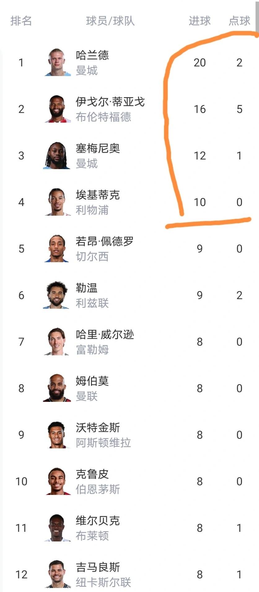 除了积分榜的争夺看点拉满,英超射手榜的竞争也同样激烈,堪称神仙打架,丝毫不逊色于争四大战。目前射手榜的榜首位置,依旧被哈兰德牢牢占据,他的进球效率依旧无解,领先优势十分明显,但这并没有阻挡其他球员的追赶脚步。