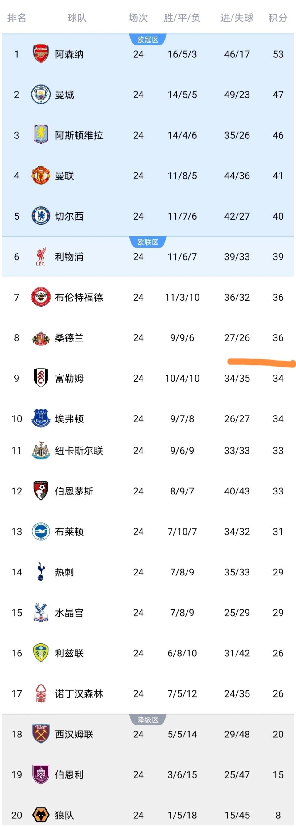 重点先划给大家:随着这场比赛结束,英超所有球队都顺利踢完了第24轮的全部赛事,积分榜彻底更新换代,桑德兰用一场3-0的横扫,实现排名大跳跃,而伯恩利则深陷降级泥潭,再加上争四集团的激烈厮杀,现在的英超,每一处看点都拉满!