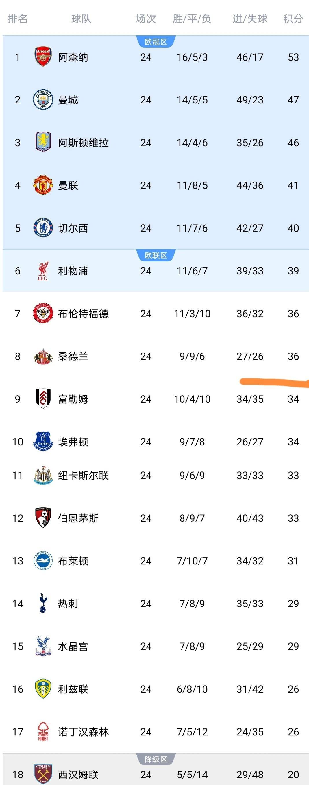 桑德兰现在与第7名的布伦特福德同分,仅因净胜球劣势屈居其后,同时只落后第6名的利物浦3分,黑马姿态愈发明显。