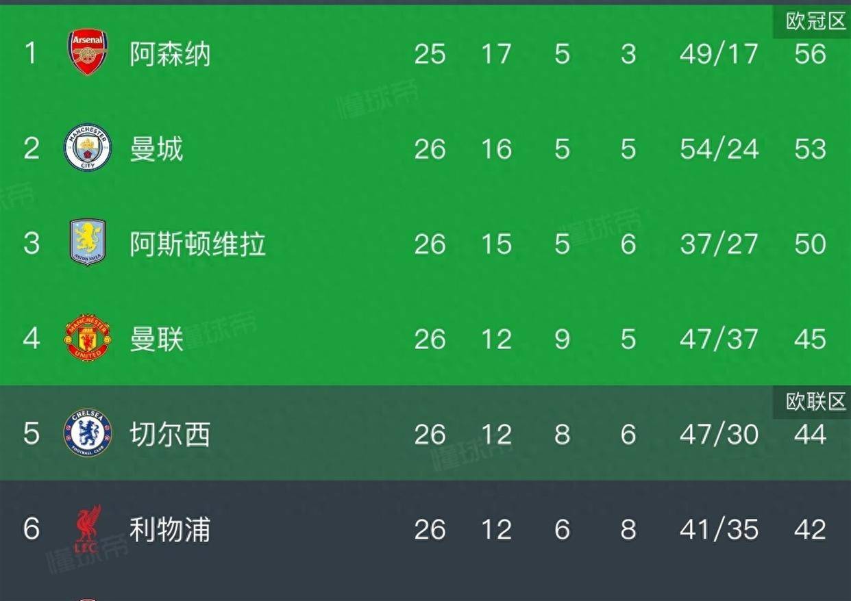 积分榜上,阿森纳以56分领跑,曼城先赛一场积53分紧随其后,阿斯顿维拉50分排名第三。 曼联45分位列第四,切尔西44分排在第五,而利物浦赢球后积42分依然排名第六,但与欧冠区的分差进一步缩小。