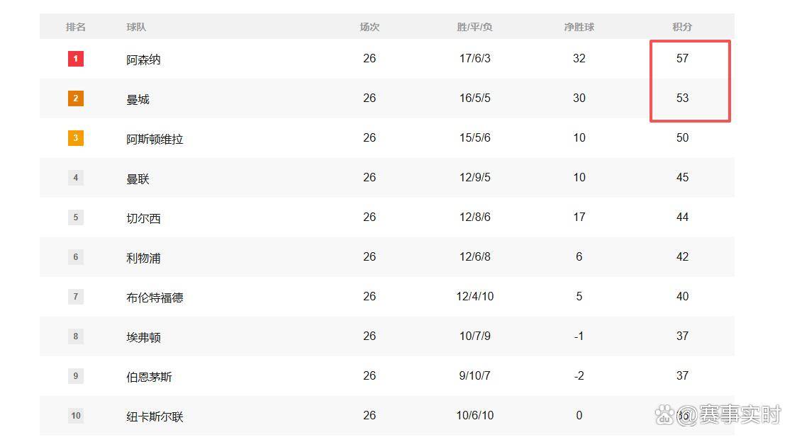 这场平局带来的最直接影响,就是英超积分榜榜首优势的急剧缩水。在本轮比赛开始前,由于曼城在2月11日先赛一场,以2-1逆转击败了利物浦,阿森纳如果能够战胜布伦特福德,本可以将领先优势扩大到6分。然而,随着这场1-1的平局,阿森纳的积分只上涨到57分,而曼城在3-0完胜富勒姆后,积分达到53分。这意味着,阿森纳对曼城的领先优势,从可能的6分,瞬间缩小到了只有4分。