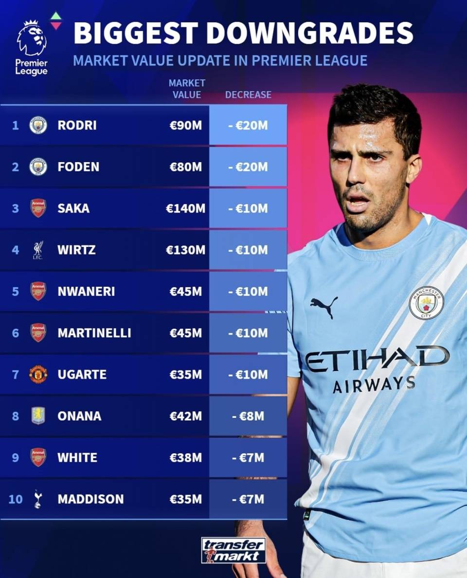 英超直播,英超赛程,英超积分榜,英超比分预测,曼联利物浦直播/覆盖2025年英超联赛所有比赛,提供免费高清中文直播入口、最新赛程安排、实时积分榜、比分预测与波胆分析,聚焦曼联、利物浦、曼城、阿森纳等豪门动态。近日,《转会市场》网站更新了英格兰足球超级联赛的球员身价评估,其中多位年轻才俊的身价实现了飞跃,而罗德里和福登等知名球星的身价则有所下滑。本文将聚焦于这些身价“下调”的球员,深入探讨其降幅是否合理,并结合他们近期的表现和身价评估的客观规则,提出一些参考性的看法。(数据截至北京时间2025年10月19日)