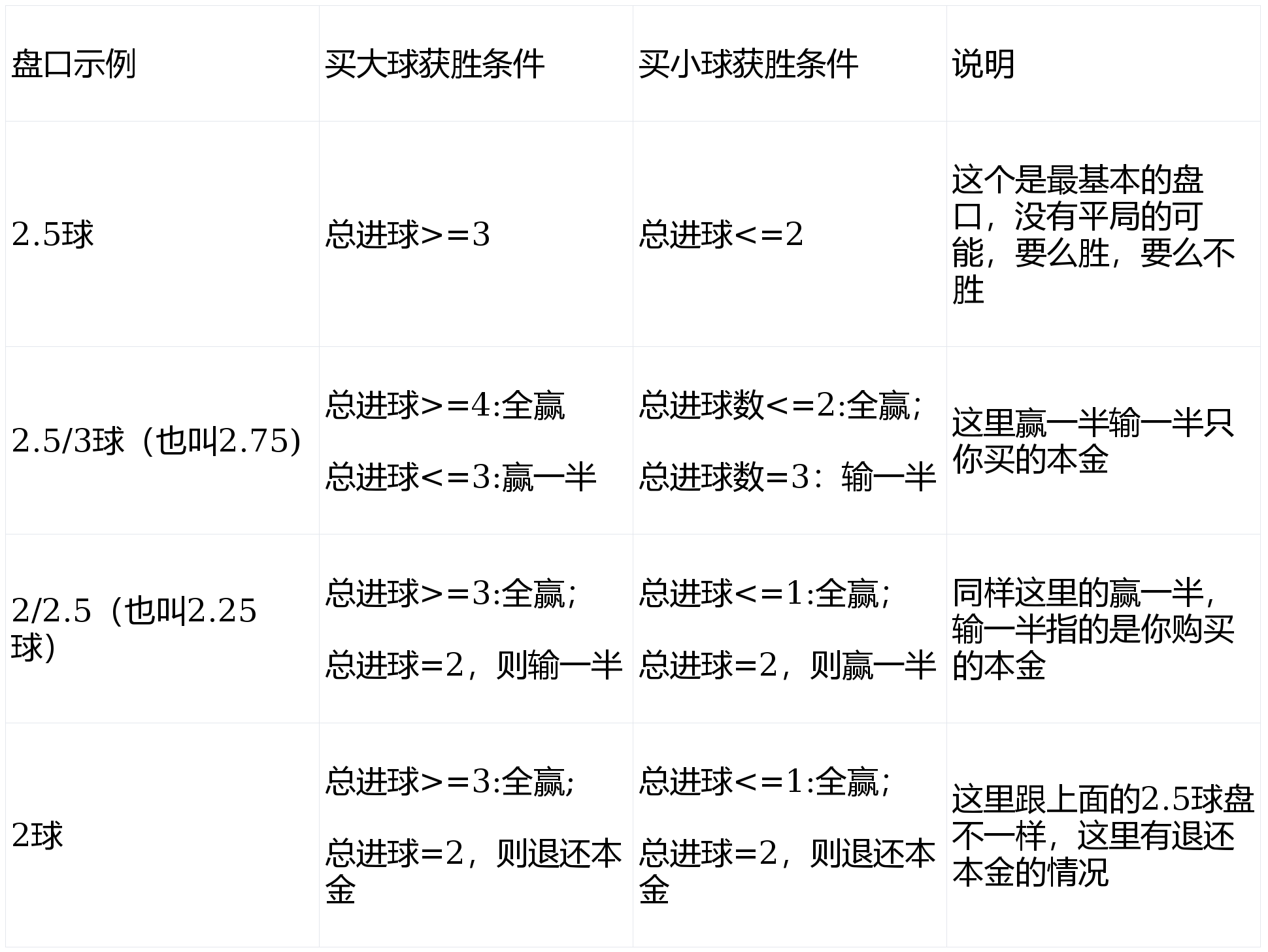 输赢的判断取决于这场比赛的进球数和预设开出的盘口值比较,常见的盘口规则如下表: