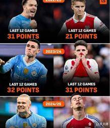 更让阿森纳球迷感到不安的,是一组冰冷的历史数据。 数据机构统计了过去三个赛季英超最后12轮的战绩,结果呈现出一边倒的态势。 2022-23赛季,曼城在最后12轮豪取31分,而阿森纳只拿到21分,正是这10分的差距最终决定了冠军归属。 2023-24赛季,曼城最后12轮积32分,阿森纳积31分,曼城依然多出1分。 到了2024-25赛季,曼城最后12轮拿到27分,阿森纳则是21分,差距扩大到6分。 连续三个赛季,曼城在联赛收官阶段的抢分能力和稳定性都完胜阿森纳。 这组数据像一道魔咒,悬在每一个关心英超争冠的人心头。