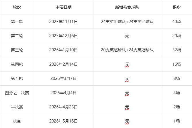 足总杯资格赛从2025年8月开打,正赛第一轮于2025年10月底至11月初开启。