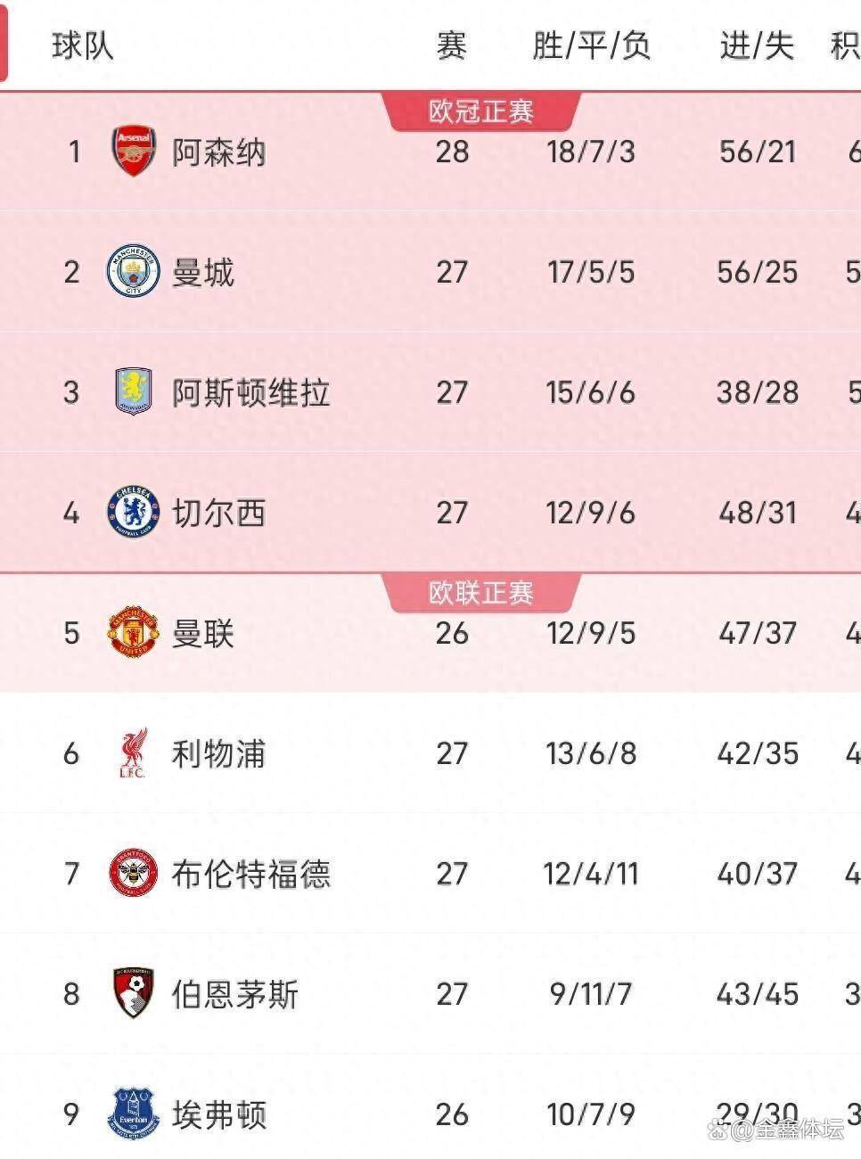 随着这几场比赛全部结束,英超联赛第27轮后的积分榜形势也变得更加明朗。阿森纳在4-1大胜热刺后,28场比赛拿到了61个积分,继续排名联赛第一。 卫冕冠军曼城在少赛一场的情况下,积56分,位列第二。 阿斯顿维拉27轮积51分,排在第三位。