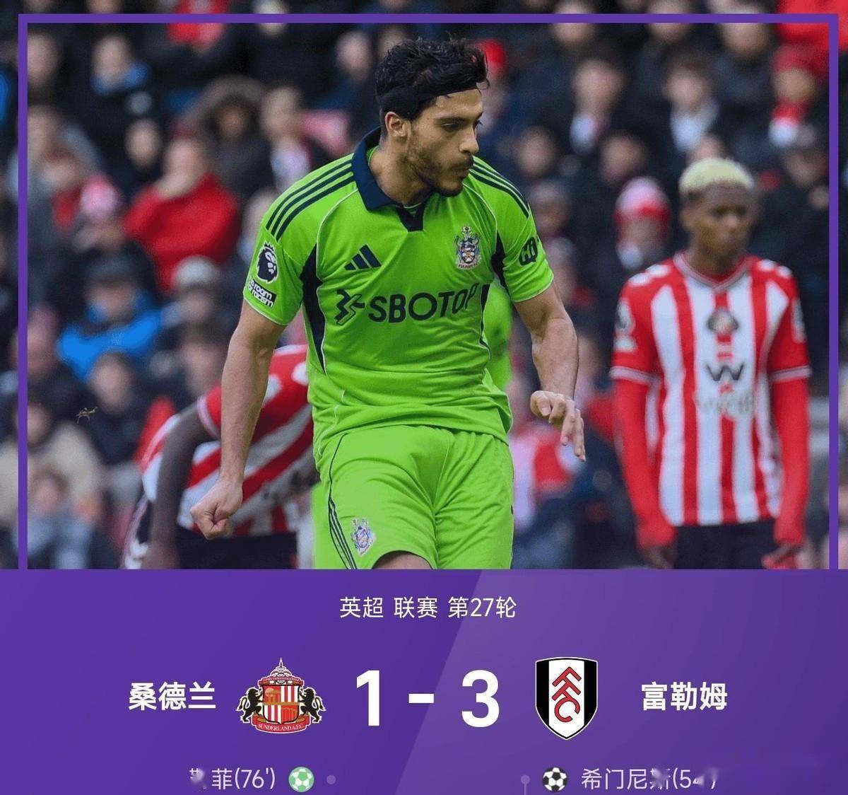在另一场比赛中,富勒姆客场3-1击败了桑德兰。这场比赛的上半场双方互有攻守但均无建树。下半场第54分钟,富勒姆获得角球机会,伊沃比开出角球,中锋希门尼斯力压防守球员头球破门,为富勒姆打破僵局。第61分钟,富勒姆球员巴锡在禁区内被桑德兰前锋布罗比拉拽倒地,主裁判在观看VAR后判罚点球。希门尼斯主罚命中,完成了本场比赛的梅开二度,将比分扩大为2-0。