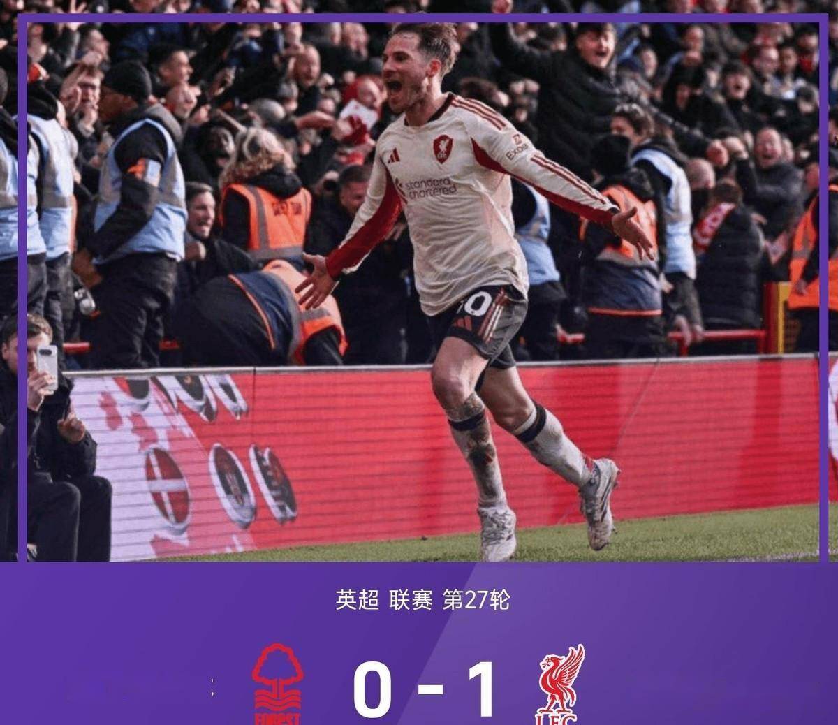 与此同时,在诺丁汉的城市球场,卫冕冠军利物浦经历了一场堪称戏剧性的比赛。 他们在全场大部分时间表现挣扎的情况下,依靠阿根廷中场麦卡利斯特在第97分钟的读秒补射,以1-0绝杀了为保级而战的诺丁汉森林,艰难地拿到了宝贵的3分。